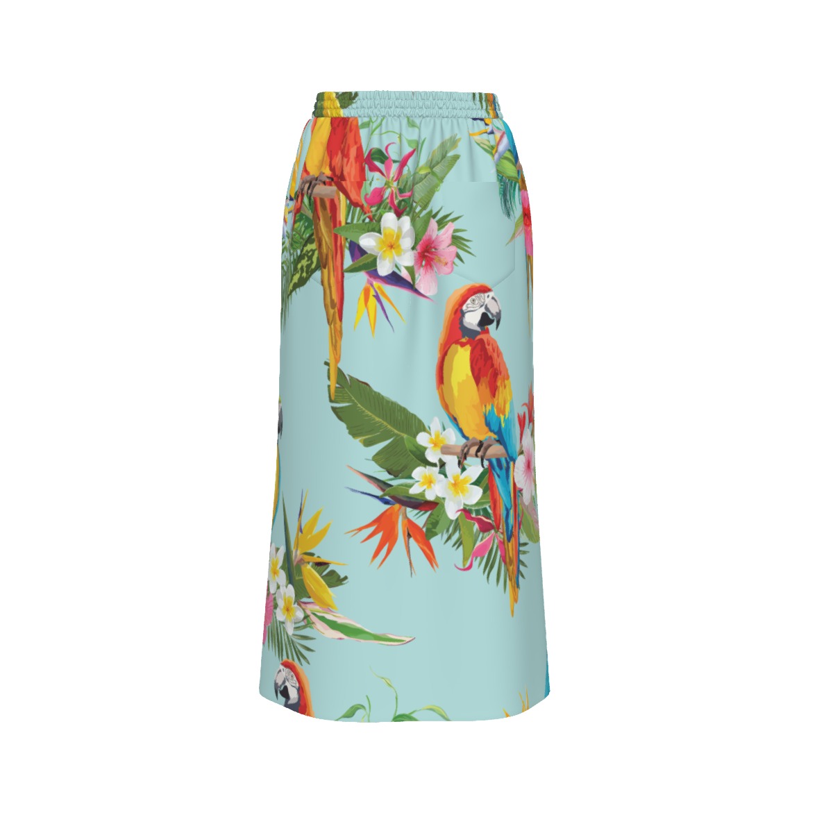 The Aria Parrot Front Mid Slit Skirt is designed with a relaxed fit and a stylish front center slit that adds effortless movement and personality, while its pure cotton canvas construction offers the comfort and breathability of natural fiber with a strong, textured surface that feels soft against the skin; the skirt features two convenient pockets and clean stitching that automatically matches the pattern for a polished finish, and it is easy to care for with instructions to machine wash cold with similar colors, avoid bleach, tumble dry on low, refrain from ironing, and skip dry cleaning to maintain its quality and shape.