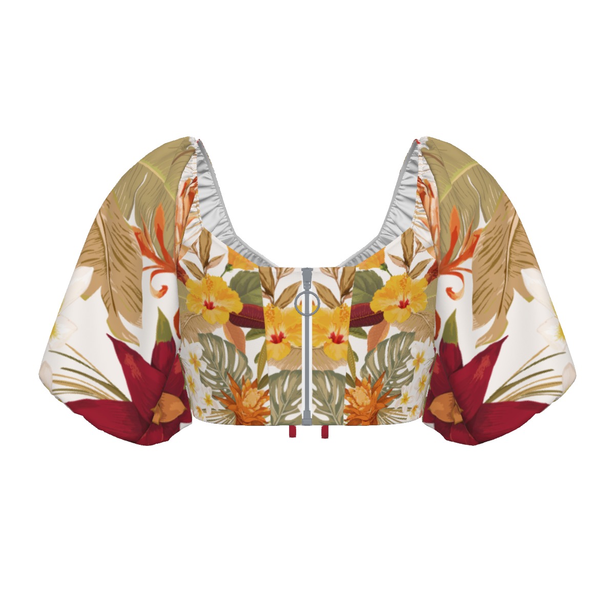 The Hibi Hibiscus Puff Sleeve Cropped Top brings a bold and fashionable touch to any outfit with its flattering square neckline that highlights the collarbone, its lace up front that adds a subtle hint of allure, and its chic puff sleeves that create a softly structured silhouette, all coming together in a stylish cropped length that pairs beautifully with denim shorts or a short skirt for an effortlessly confident look; made with a smooth four way stitch fabric that offers comfort and shape, it is easy to care for by machine washing it in cold water with similar colors, avoiding bleach, tumble drying on low, and refraining from ironing or dry cleaning to maintain its quality and appearance.
